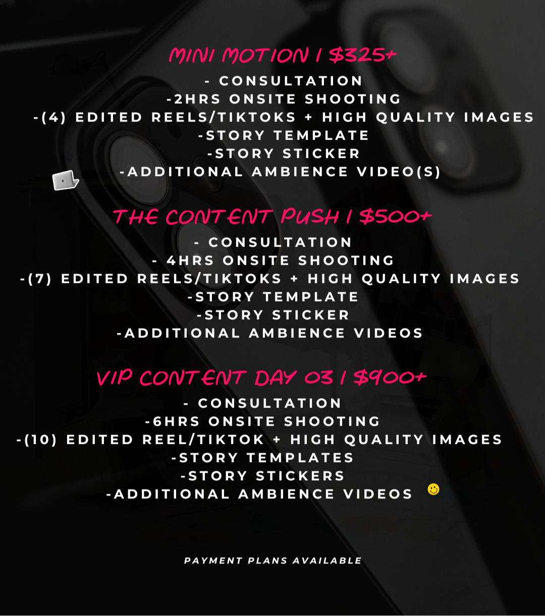 - All packages include creative direction, high-quality visuals, and content that’s styled with strategy — not just vibes.